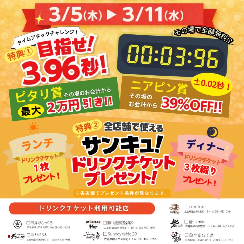• ピタリ賞(3.96秒): 本日のお会計を【全額無料】とさせていただきます。